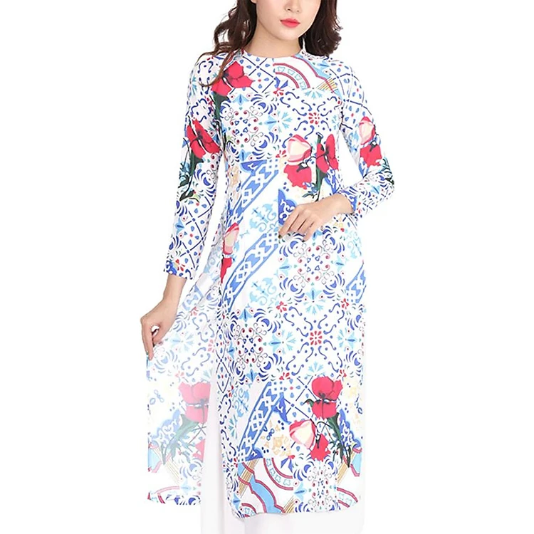 • Phần tà trước và sau được thiết kế ngắn trên gối không chỉ giúp bạn nữ trông thật xinh xắn mà còn giúp cho việc di chuyển thêm phần dễ dàng. Điểm đặc biệt của bộ trang phục chính là họa tiết in gạch bông nhiều màu sắc sảo, nổi bật.