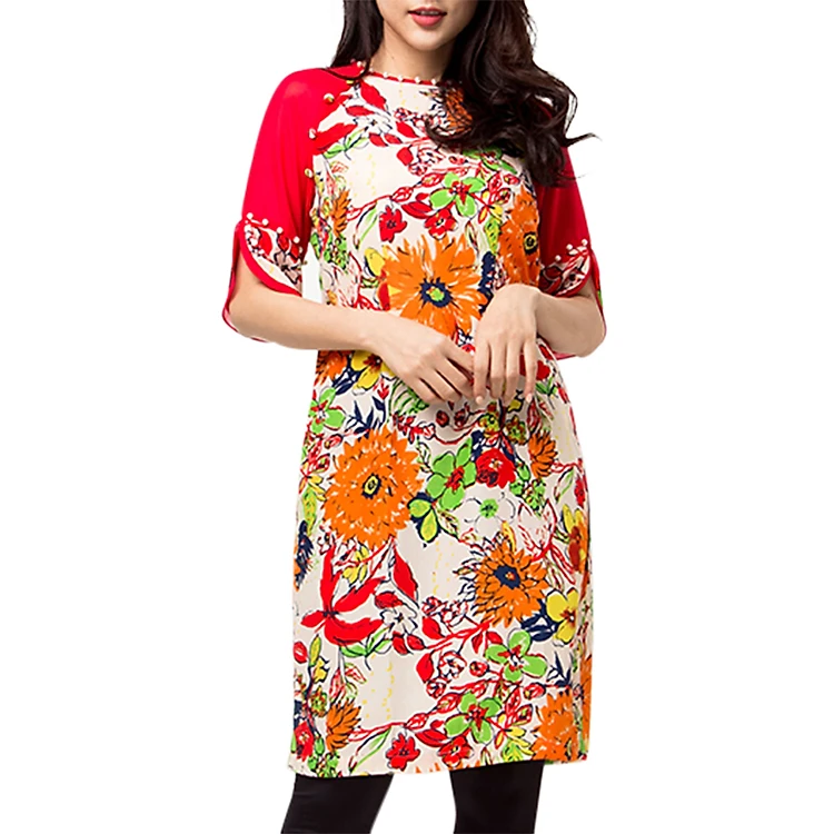 - Cổ áo tròn cùng tay lửng cách điệu, phối hợp màu sắc tươi tắn trẻ trung, nổi bật của hoạ tiết hoa xinh xắn.