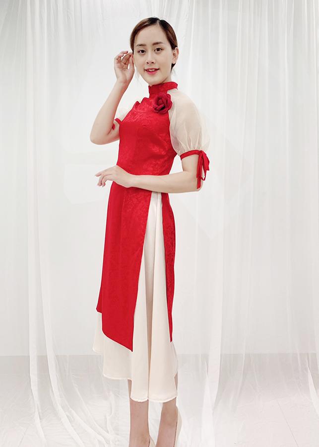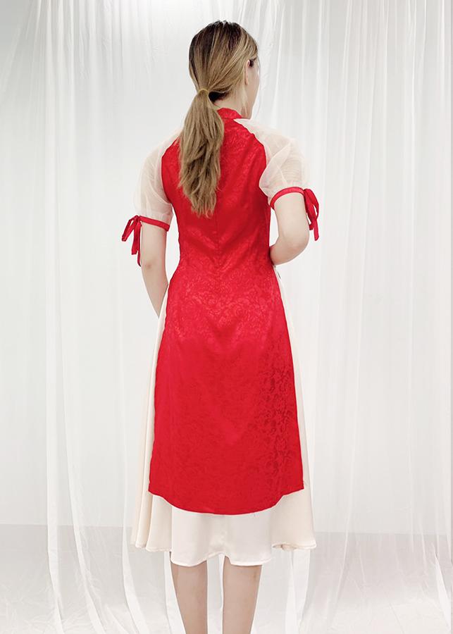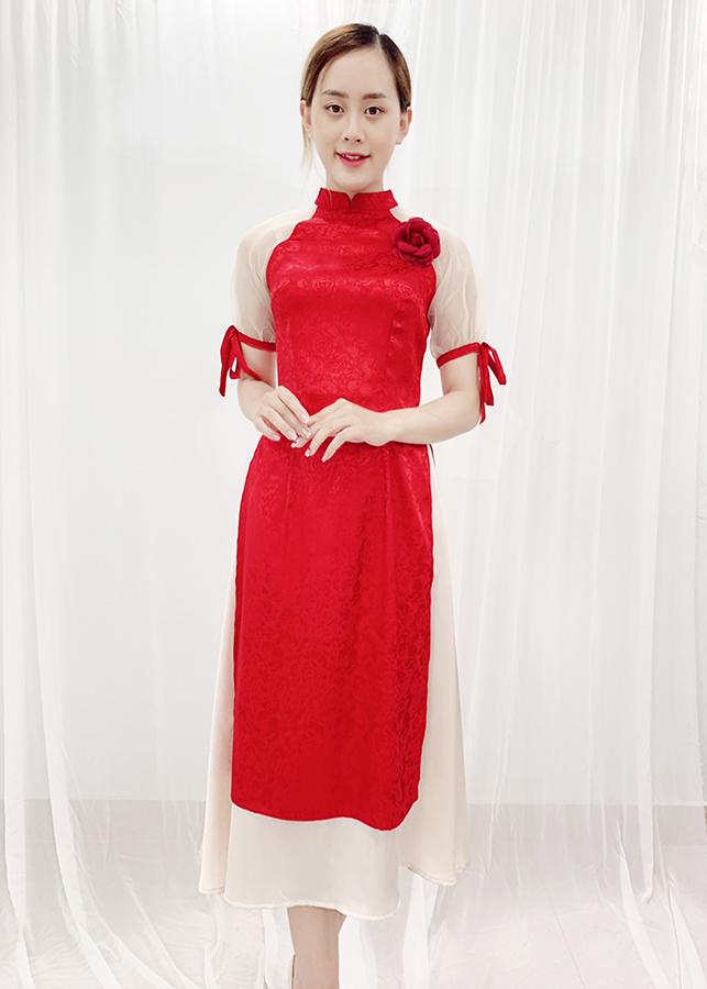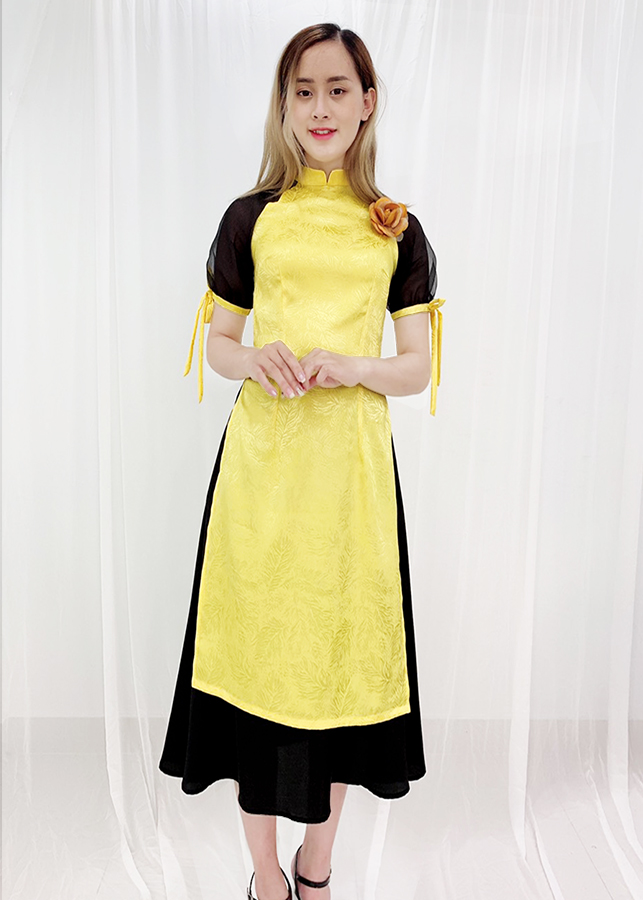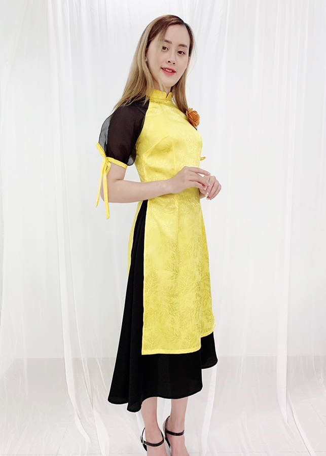 - Thiết kế dáng áo dài tà ngắn ngang gối, tay lỡ trẻ trung, thiết kế tay voan lưới tạo độ phồng rất đẹp, chất liệu gấm cao cấp co giãn ít nhưng vẫn tạo được cảm giác thoải mái.
