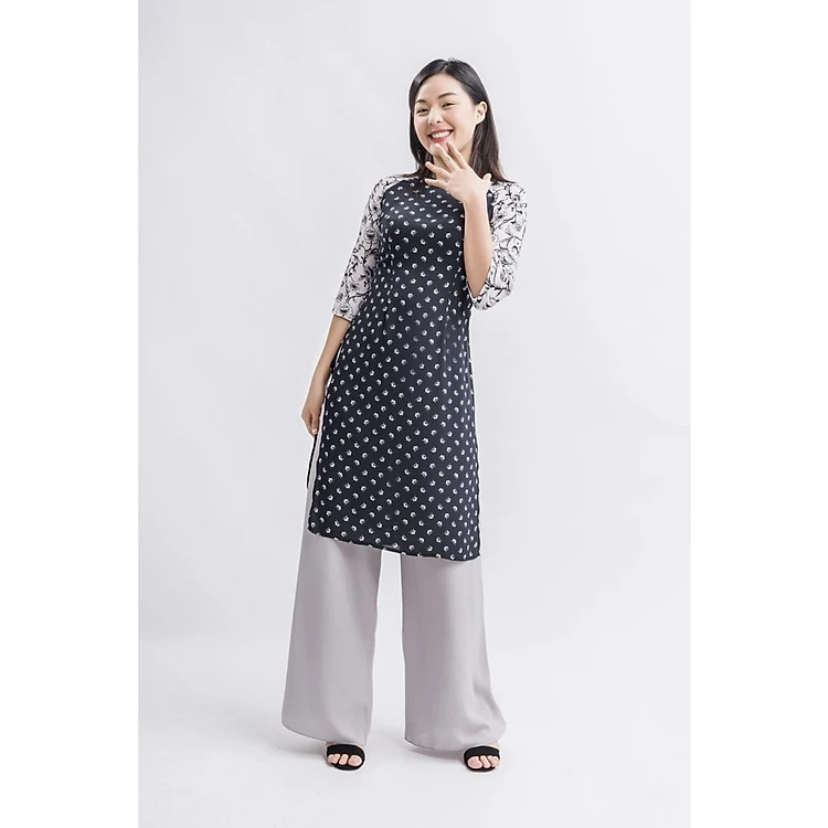 ÁO DÀI CÁCH TÂN THÂN HOA PHỐI TAY MÀU ĐEN