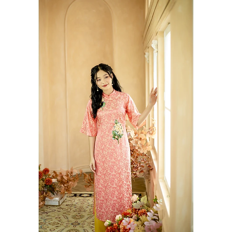 Áo dài cách tân thiết kế lụa cam kết hoa cam ( size M)