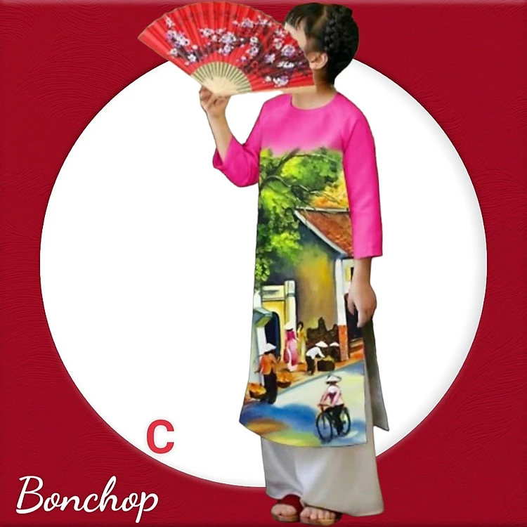 Áo dài cho bé gái hình phố cổ xưa và nay từ 10-42kg. Vải phi lụa