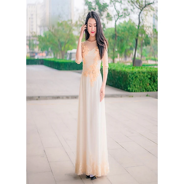 Áo sử dụng vải Chiffon cát lụa cao cấp, chất vải mềm mại và co giãn giúp người mặc thướt tha, khoe nhan sắc rạng ngời trong trang phục truyền thống dân tộc.