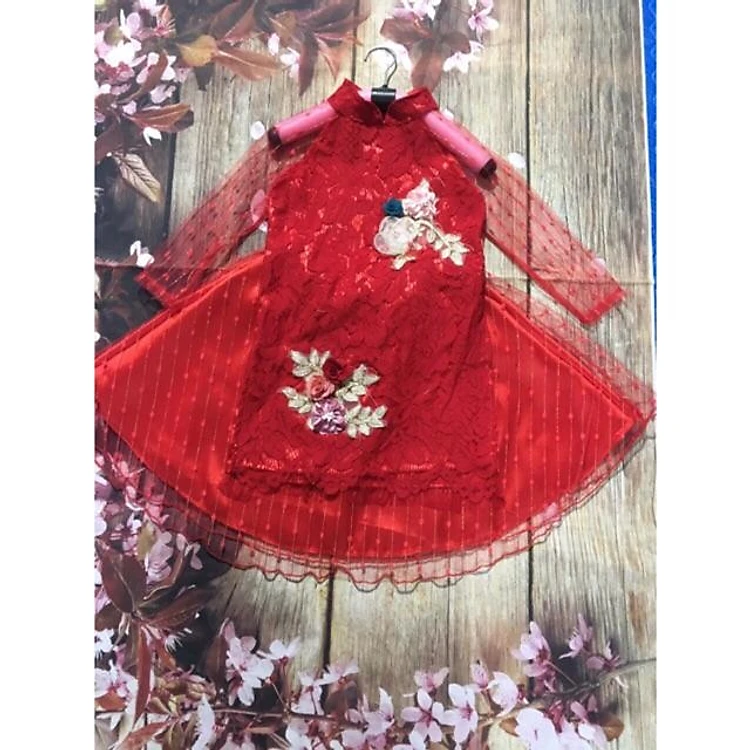 Áo dài hoa trà nổi cho bé gái 9-19kg