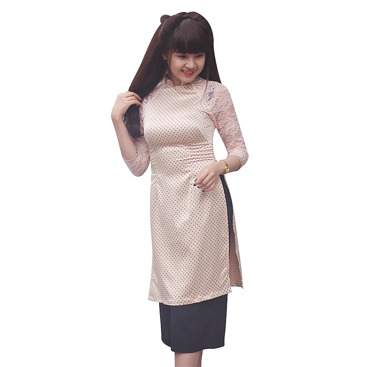 - Áo Dài Lụa Chấm Bi FATRALY với chất liệu vải kate phối với cotton lụa mềm co giãn nhẹ.