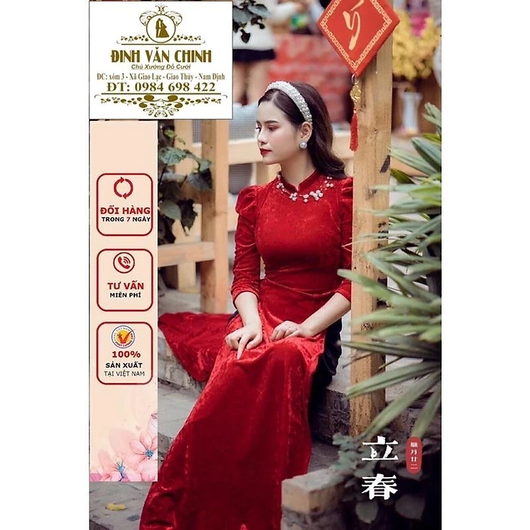 Áo dài nhung nhám truyền thống cao cấp với thiết kế tay bồng lỡ siêu xinh