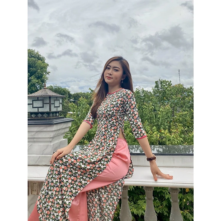 Áo dài nữ đen hồng họa tiết cúc họa mi