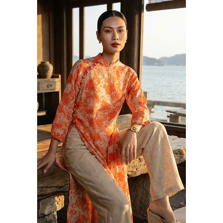 Áo Dài Suông Tay Raglan Vải Gai Xanh Ramie Hoa ADA001 thời trang thiết kế Hity