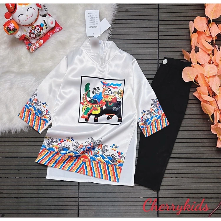 Áo dài tết cho bé trai mẫu tranh đông hồ từ 12-40kg hàng thiết kế cao cấp (áo lẻ không kèm quần)