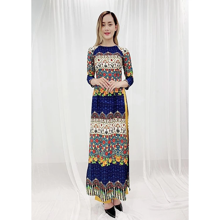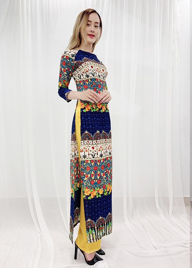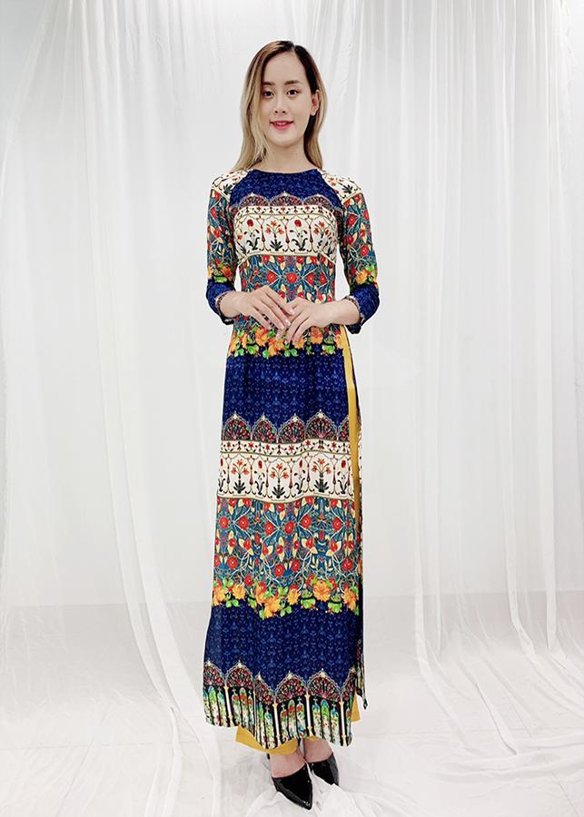 - Thiết kế dáng áo dài truyền thống, in họa tiết trẻ trung, tay lỡ, viền màu tạo điểm nhấn, chất liệu co giãn ít nhưng vẫn tạo được cảm giác thoải mái.