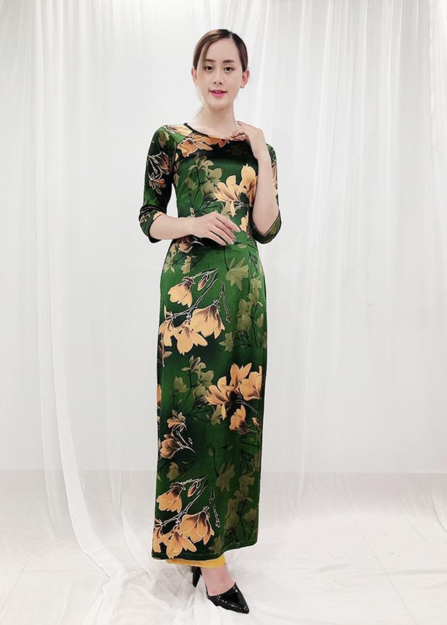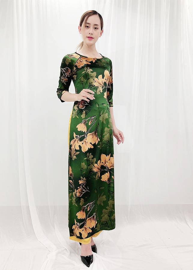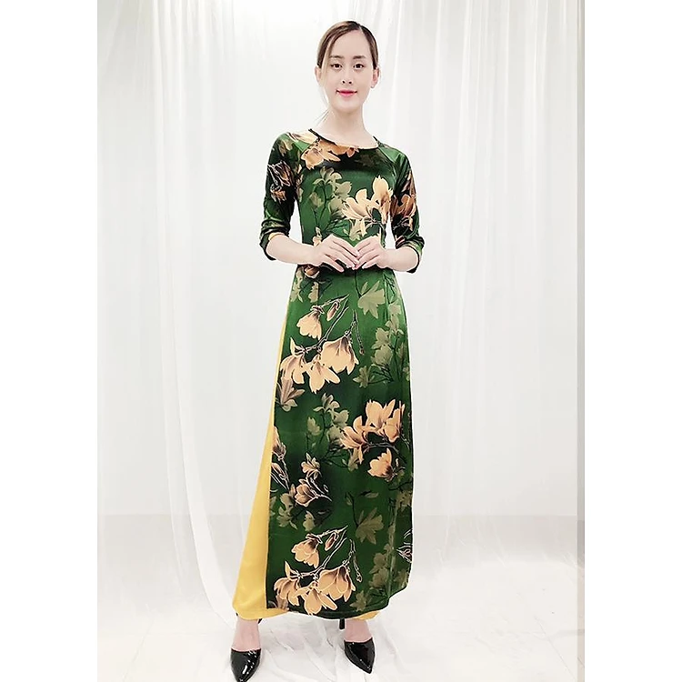 - Thiết kế dáng áo dài truyền thống, nhung in hoa trẻ trung, tay lỡ, viền màu tạo điểm nhấn, chất liệu co giãn ít nhưng vẫn tạo được cảm giác thoải mái.
