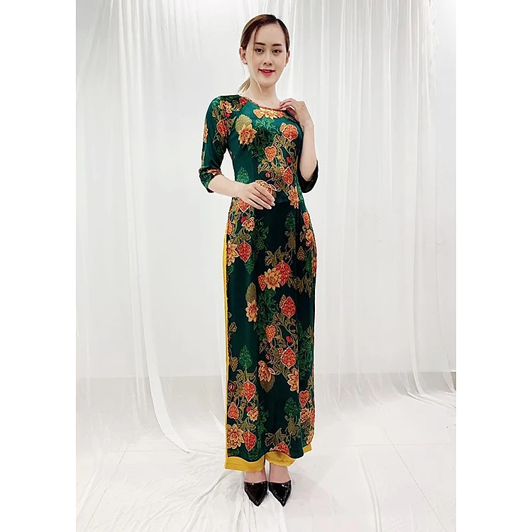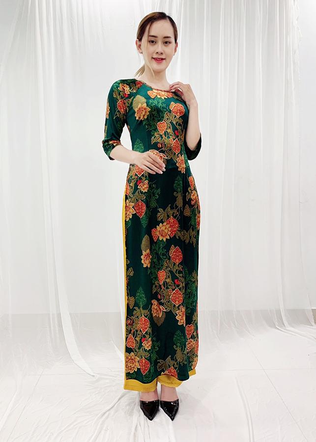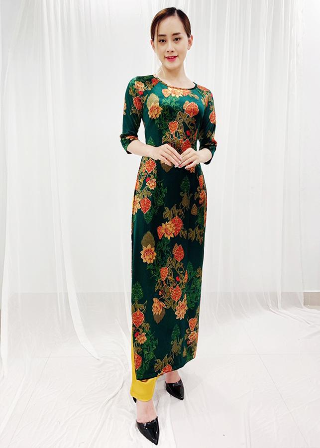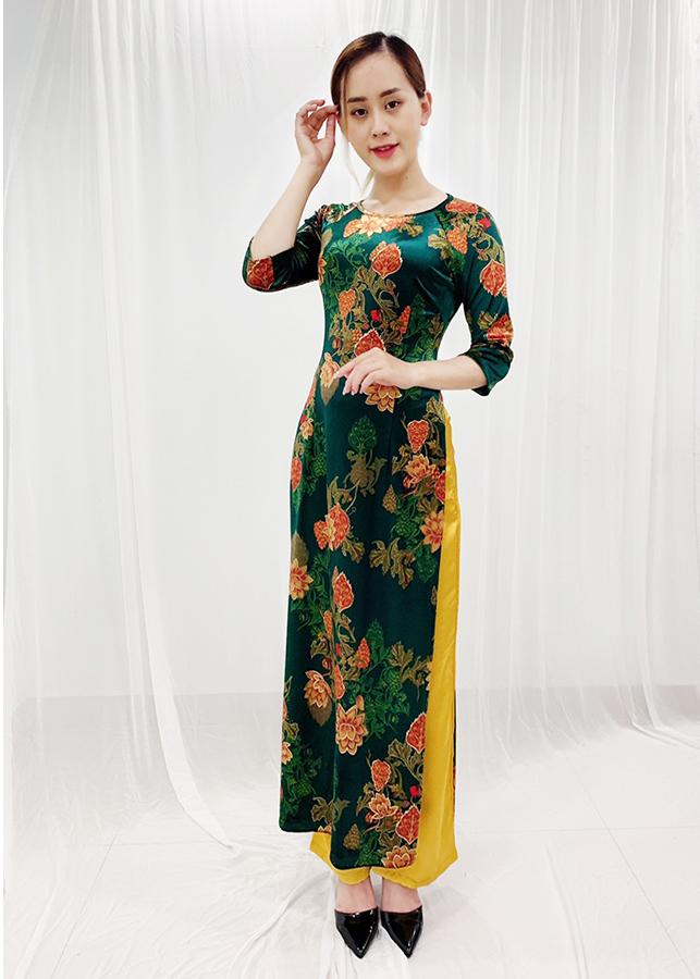 - Kiểu dáng: Áo dài nhung được thiết kế cổ tròn thuyền, được in hình hoa nhũ kim tuyến, có co giãn nhẹ ( KHÔNG KÈM QUẦN)