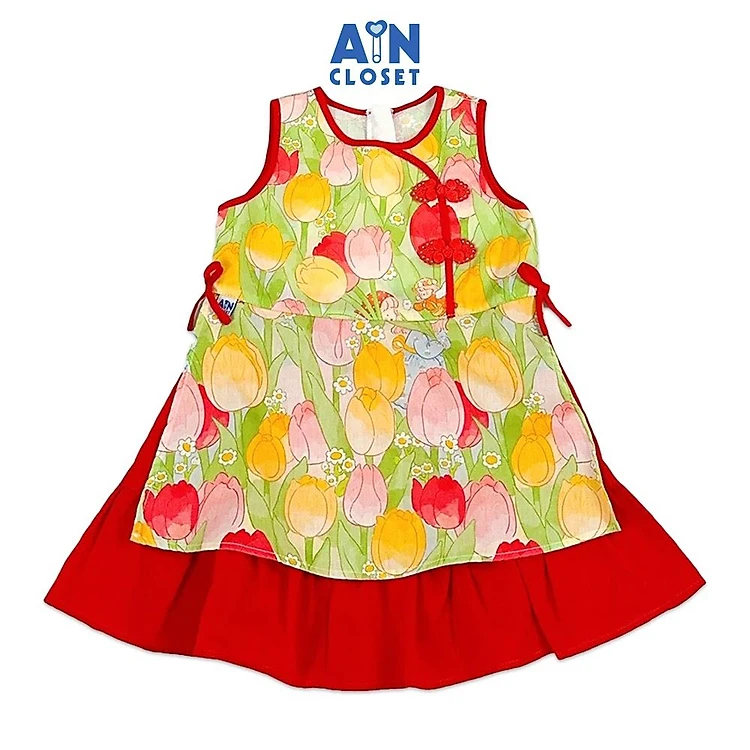 Áo dài váy bé gái họa tiết Tulip Đỏ cotton - AICDBGZZV72P - AIN Closet