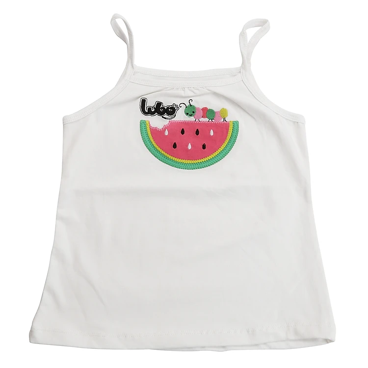 Áo thiết kế 2 dây, cổ ngang, phom may vừa vặn. Trước ngực có in hình họa tiết dưa hấu xinh xắn và đáng yêu. Đường may kỹ lưỡng, đều và tinh xảo vừa tăng thêm tính thẩm mỹ, vừa cho bé cảm giác thoải mái khi chơi đùa hay chạy nhảy.