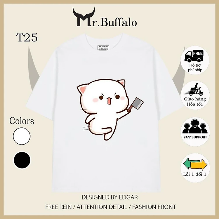 Áo đôi , áo thun cặp nam nữ tay lỡ Unisex mèo mochi dượt nhau form rộng vải cotton 100% T25T26 - Mr.Buffalo