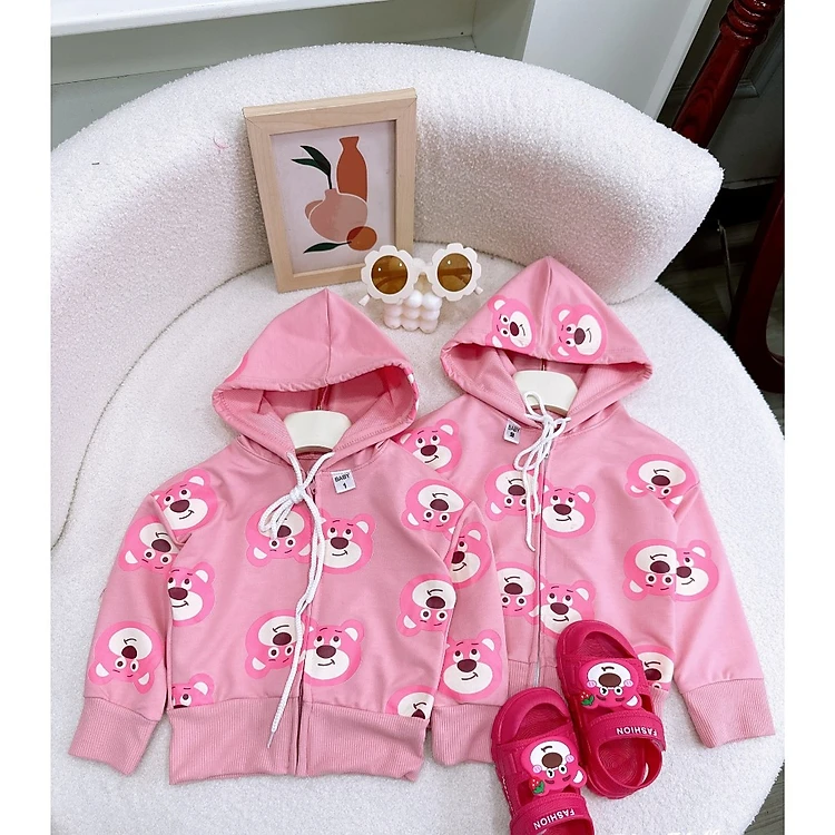 Áo khoác chống nắng có nón cho bé gái hình Gấu dâu lotso từ 10-30kg chất da cá mịn mát