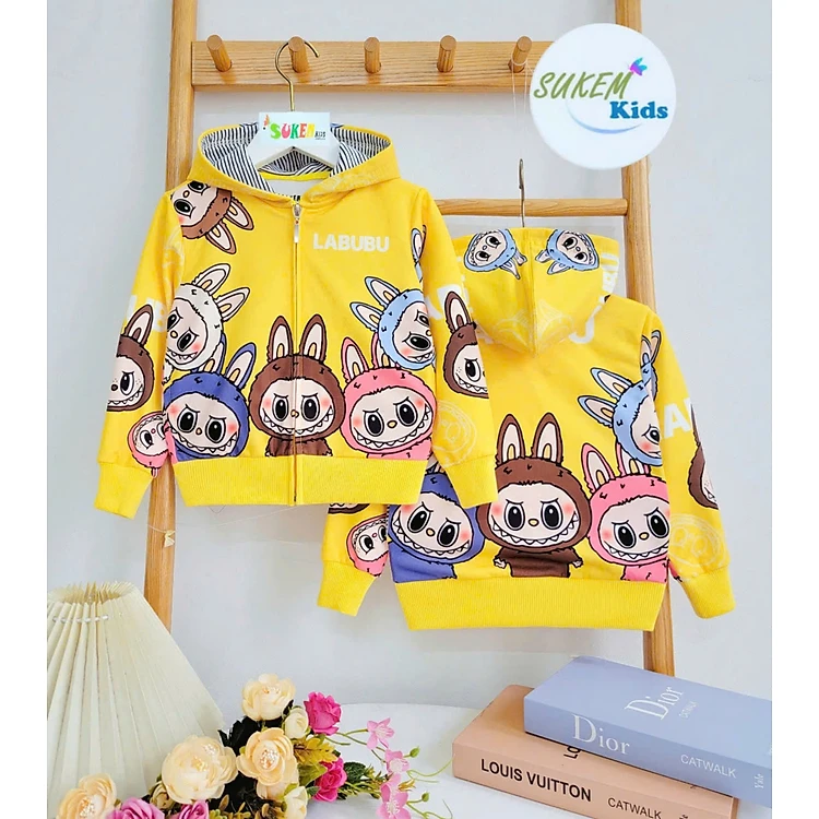 Áo khoác chống nắng có nón cho bé gái hình Labubu từ 10-40kg chất da cá mịn mát