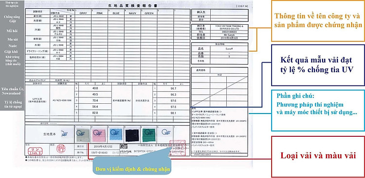 Sp được viện dệt may VN chứng nhận chứng nhận đạt chỉ số UPF 40+ (chỉ số chống tia UV)