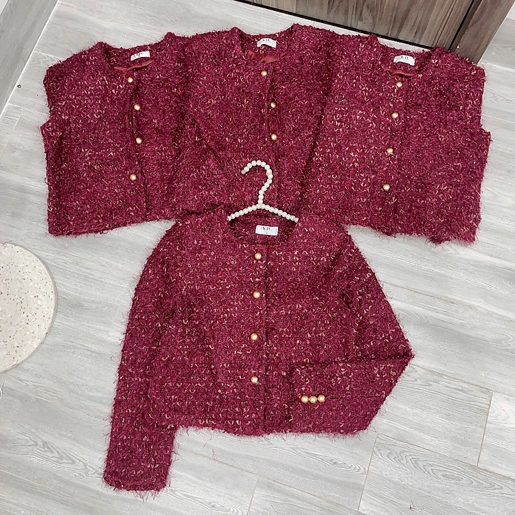 Áo khoác dạ nữ tua rua cúc vàng màu đỏ