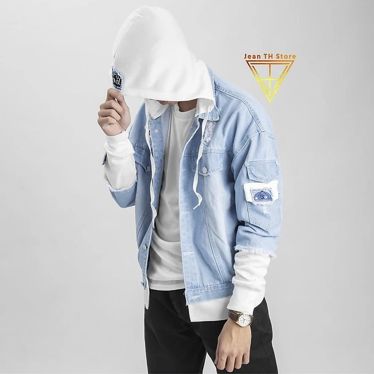 Áo khoác jean xanh phối nón nỉ trắng cao cấp, áo khoác bò phối mũ trẻ trung năng động