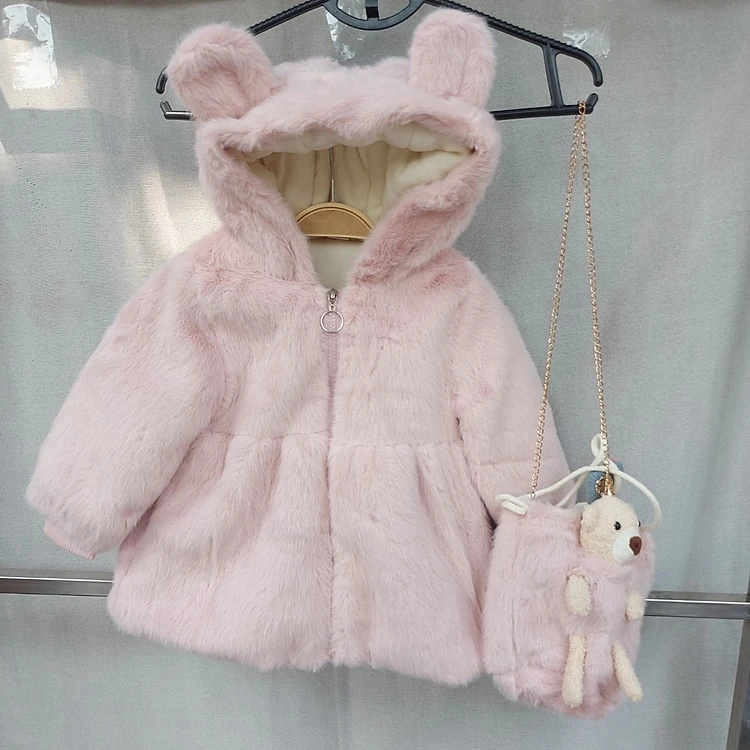 Áo khoác lông bé gái 2-7 tuổi tai thỏ kèm túi đeo. Áo lông cho bé siêu ấm hàng Quảng Châu cao cấp