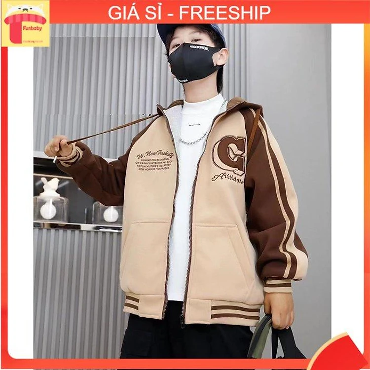 Áo khoác nỉ bé trai size đại 10-18 tuổi phối màu thêu đáp chữ C, Áo khoác cho bé