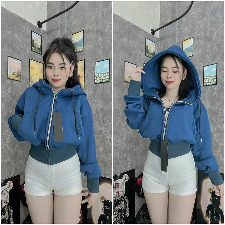 Áo khoác nỉ croptop tay dài trơn có mũ chùm đẹp hàng rất đẹp-A2029