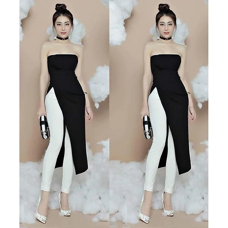 Áo Kiểu Cúp Ngực Dài Giả Đầm Và Quần Dài Ống Ôm Thanh Lịch (Nguyên Bộ)