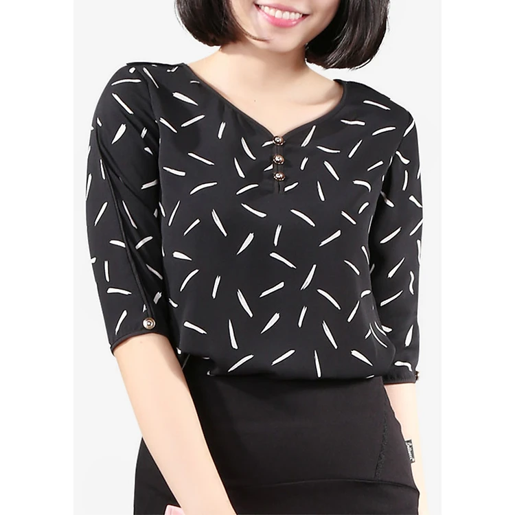 Áo Kiểu Nữ Cổ Chữ Y Phối Họa Tiết - Đen
