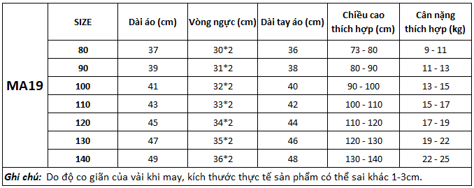 - Hàng có sẵn đủ size cho bé từ 9kg (size 80) đến 25kg (size 140).