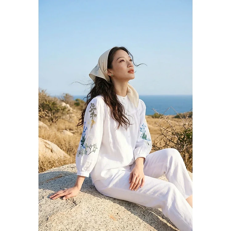 Áo Sơ Mi Cổ Trụ Linen Trắng Thêu Tay Hoạ Tiết Độc Quyền Mơ TOP206 Thời trang Hity