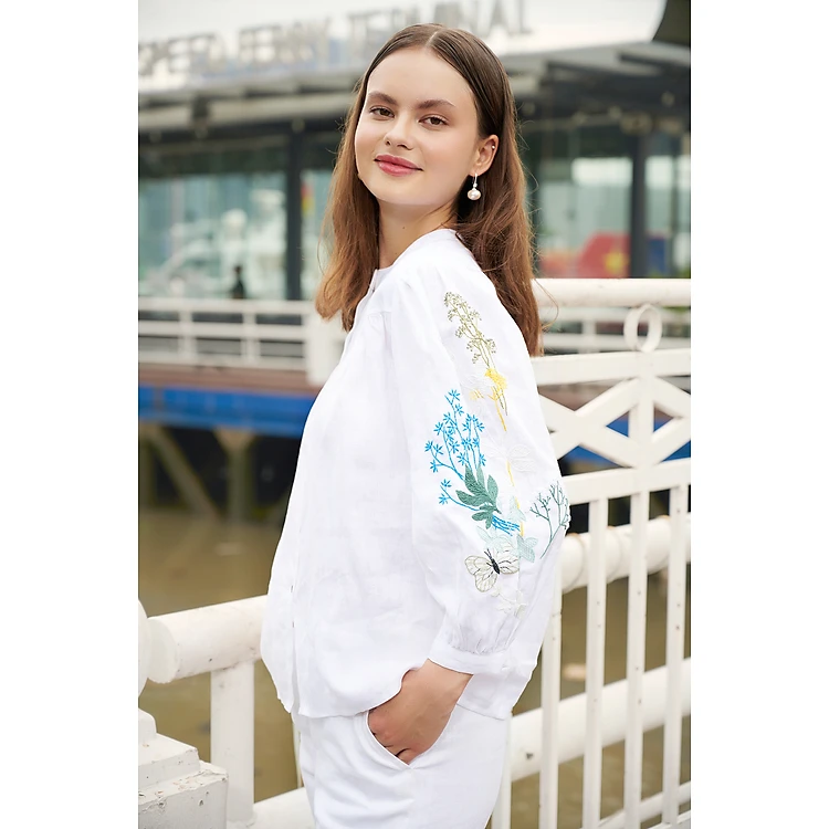 Áo Linen Thêu Tay Mơ, Áo Sơ Mi Cổ Trụ TOP206 Thời trang thiết kế Hity
