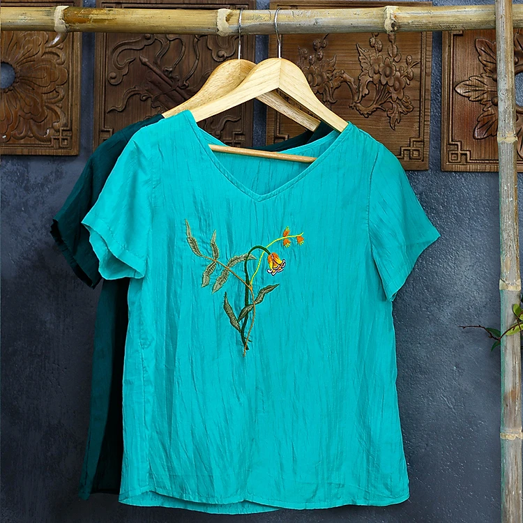 Áo lụa tay ngắn cổ tim họa tiết thêu tay Hướng Dương - Levusilk
