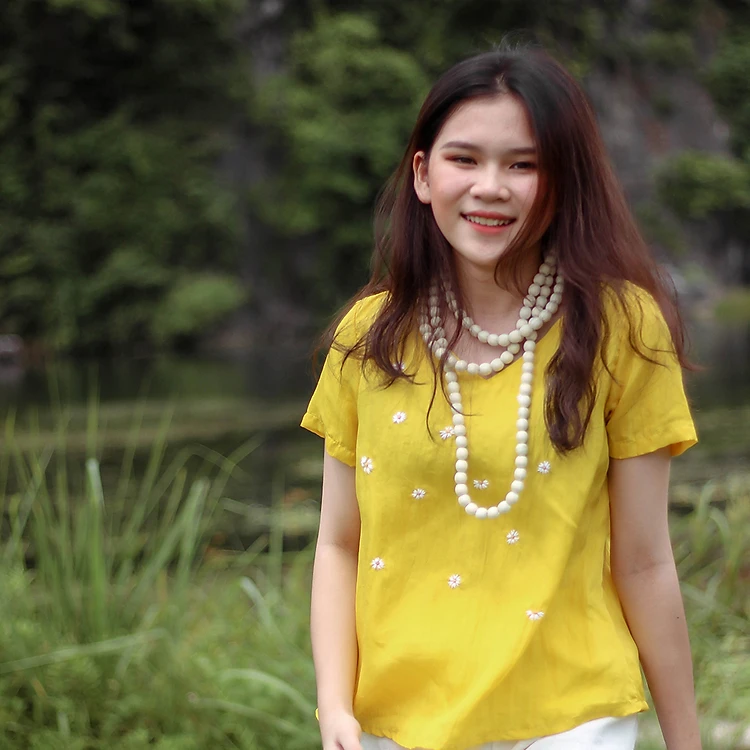 Áo lụa tay ngắn cổ tim họa tiết thêu tay Hướng Dương - Levusilk