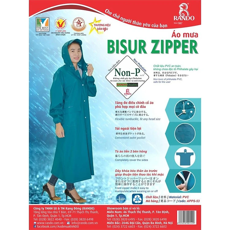 Áo Mưa Bít Sườn Bisur Zipper, GIÁ SỈ, RANDO Chính Hãng, 1 Người Mặc Có Dây Kéo, Nhựa Cao Cấp, Bền Bỉ Không Thấm Nước