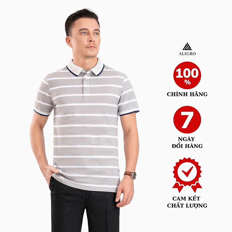 Áo Polo nam ngắn tay kẻ ngang ghi-trắng ALGPLO89