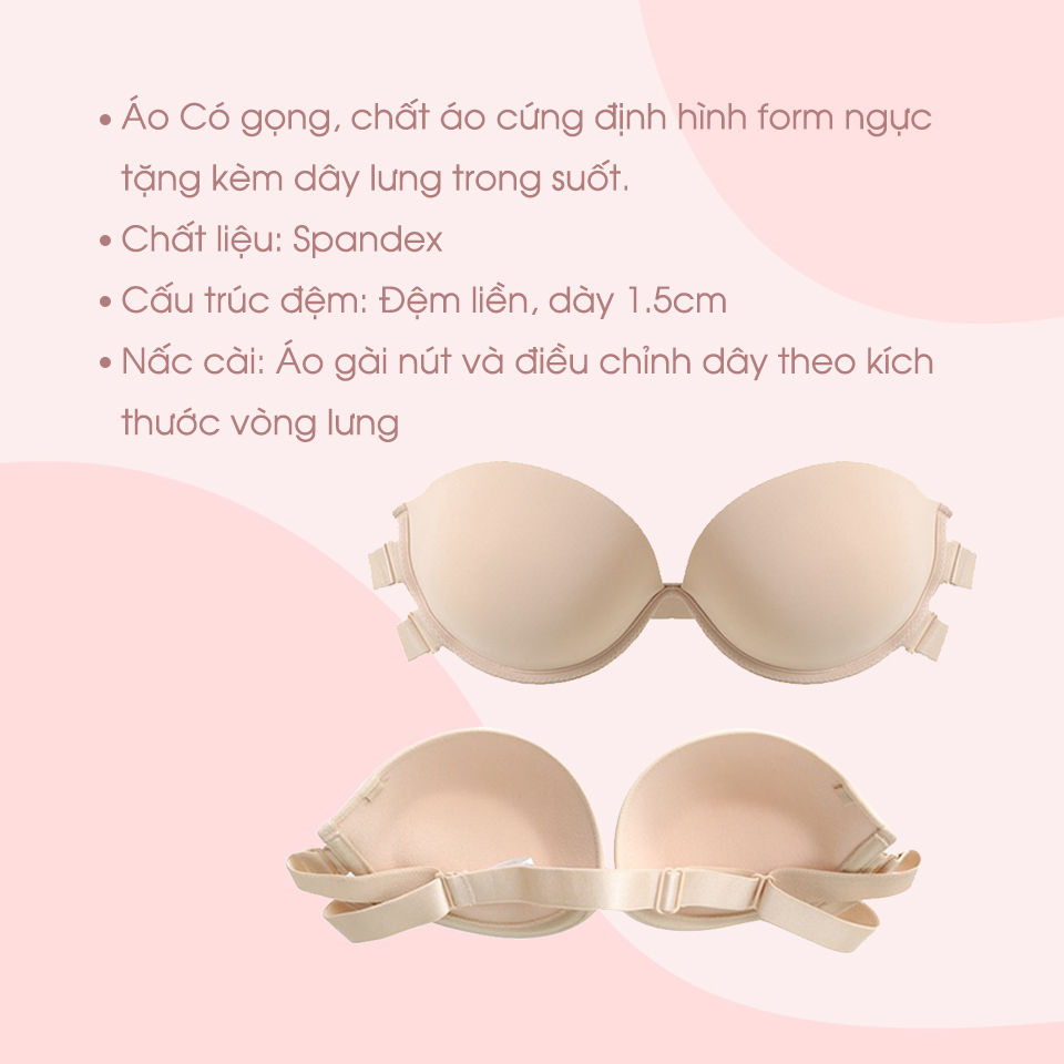 Đặc điểm chung: Có gọng, chất áo cứng định hình form ngực chắc chắn, không rơi tuột, áo được tặng kèm dây lưng trong suốt.