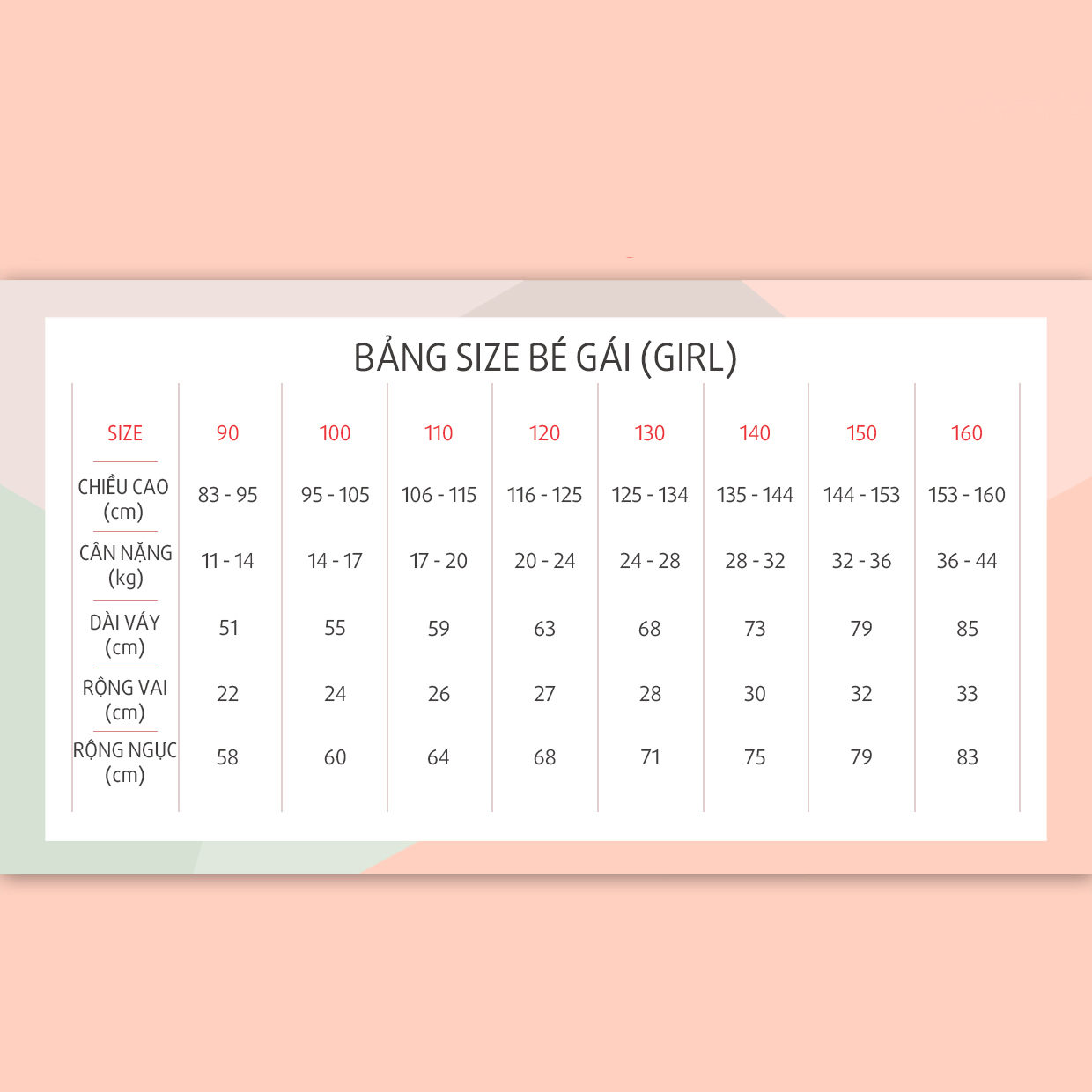 Váy cho bé có size từ 90 đến 140 tương đương bé có cân nặng từ 11kg đến 32kg ( chiều cao từ 83cm đến 144cm)