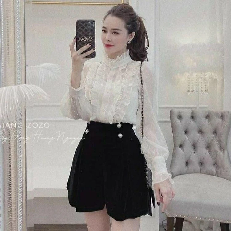 Áo sơ mi bánh bèo tiểu thư pha ren cổ trụ
