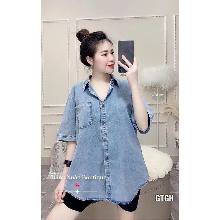 Áo Sơ Mi Bò Cộc Tay Áo Somi Nữ Ngắn Tay Túi Trước Vải Denim Dáng Rộng