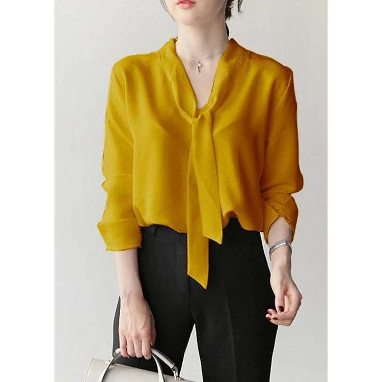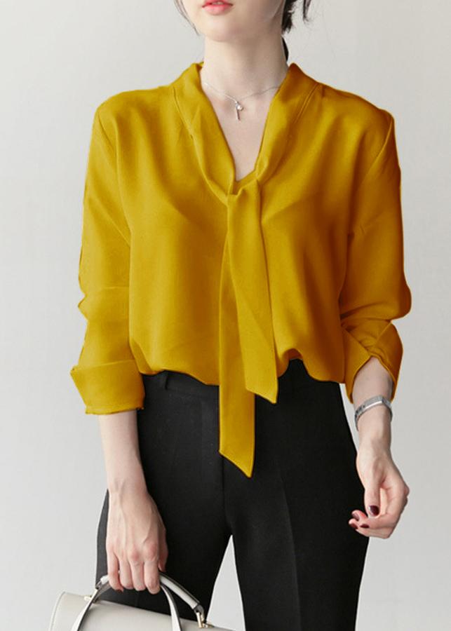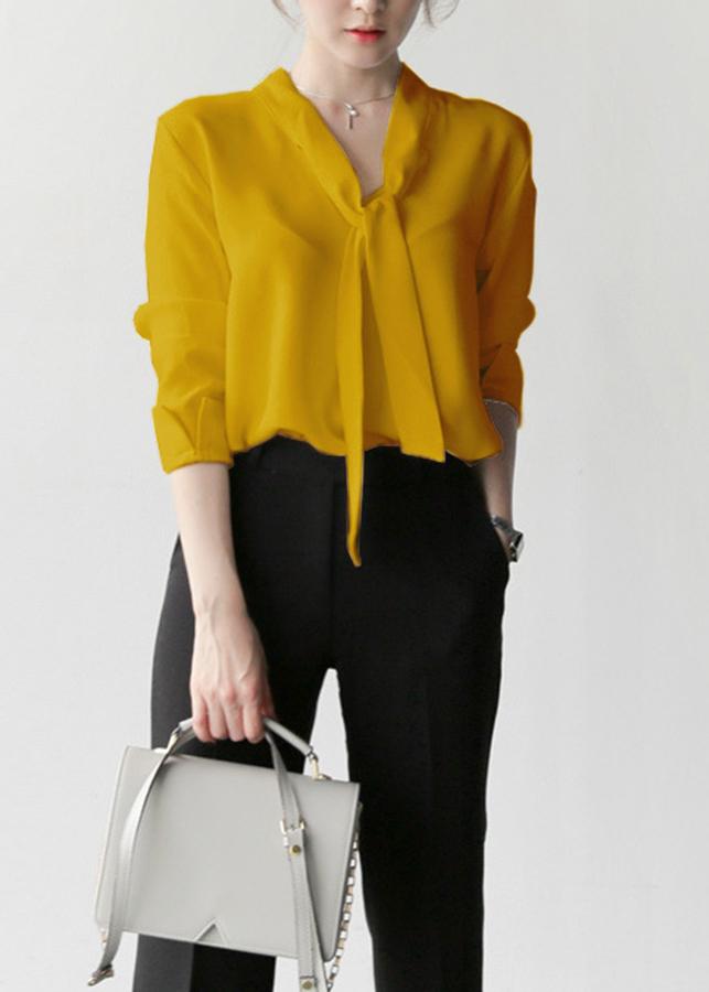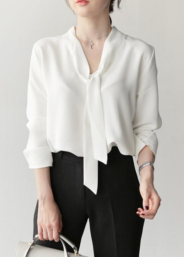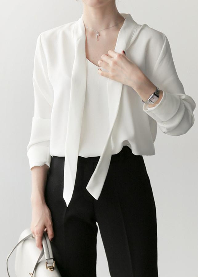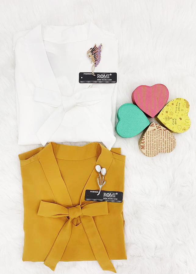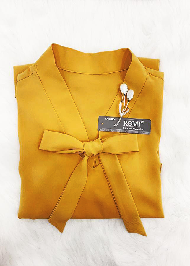 - Thiết kế dáng áo dáng suông rộng, tay dài lật chữ v, cổ v cột nơ, chất liệu co giãn tốt tạo được cảm giác thoải mái.