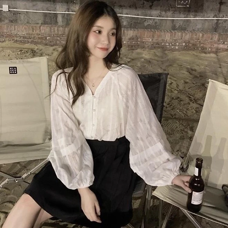 Áo sơ mi dài tay bồng cổ V viền ren cúc ngọc. Áo babydoll cổ tim viền ren