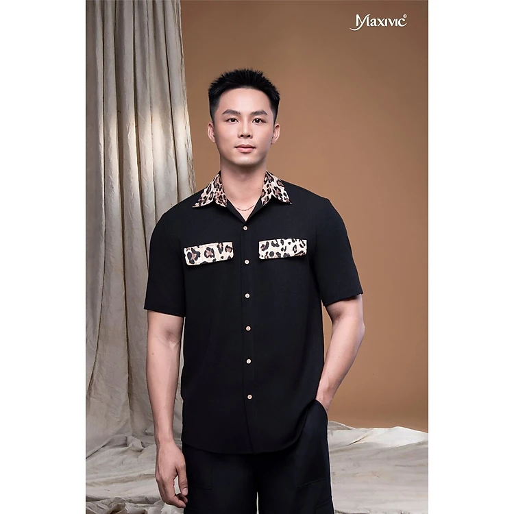 Áo sơ mi đen xô cát phối beo cổ túi LM112452 [BST Da Beo]