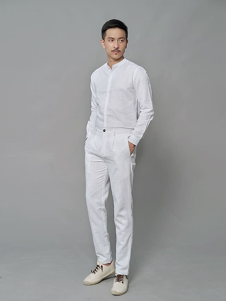 Tổng thể mẫu áo đũi dáng sơ mi cổ tàu màu trắng.
