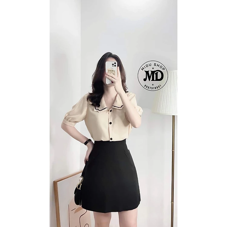 Áo sơ mi lụa nữ lụa tay lỡ trắng cổ viền đen