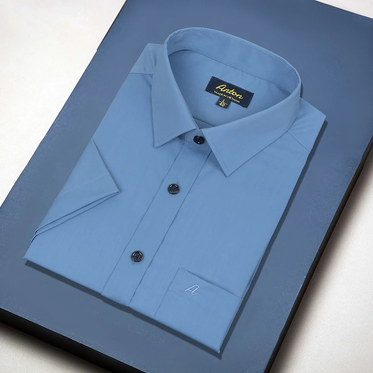 Áo Sơ Mi Nam Công Sở Trung Niên Thương Hiệu Anton Somianton Vải Cotton Màu Xanh Trơn Ngắn Tay Có Túi - YSN13