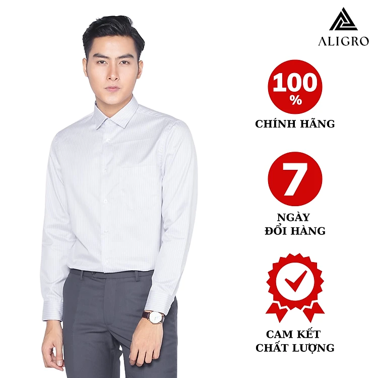 Áo sơ mi nam dài tay ALIGRO ghi sọc trắng,100% chất cotton, thoáng mát, thấm hút mồ hôi tốt, cổ bẻ dáng ôm body ALGS132