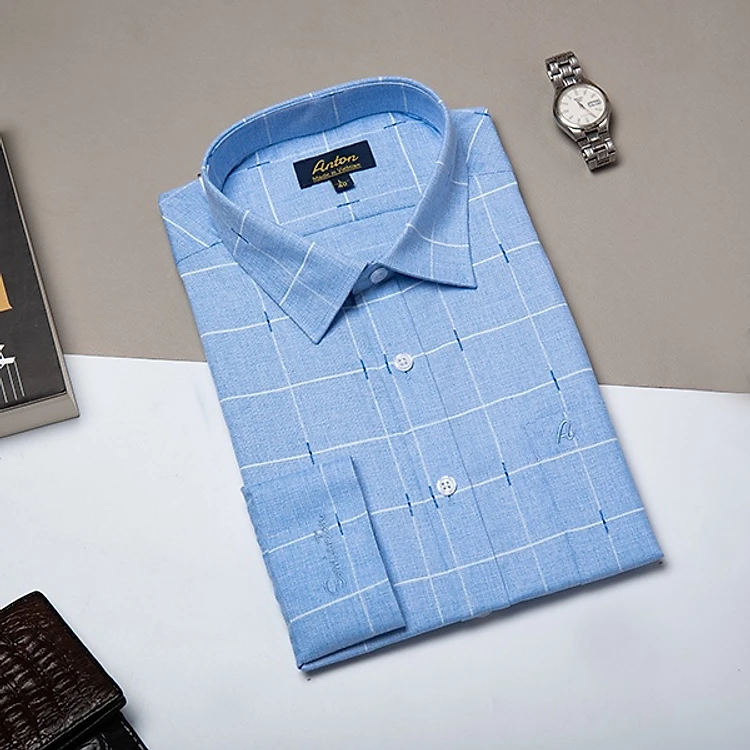 Áo sơ mi nam dài tay công sở trung niên thương hiệu Anton vải sợi tre kẻ caro màu xanh dương – X8553