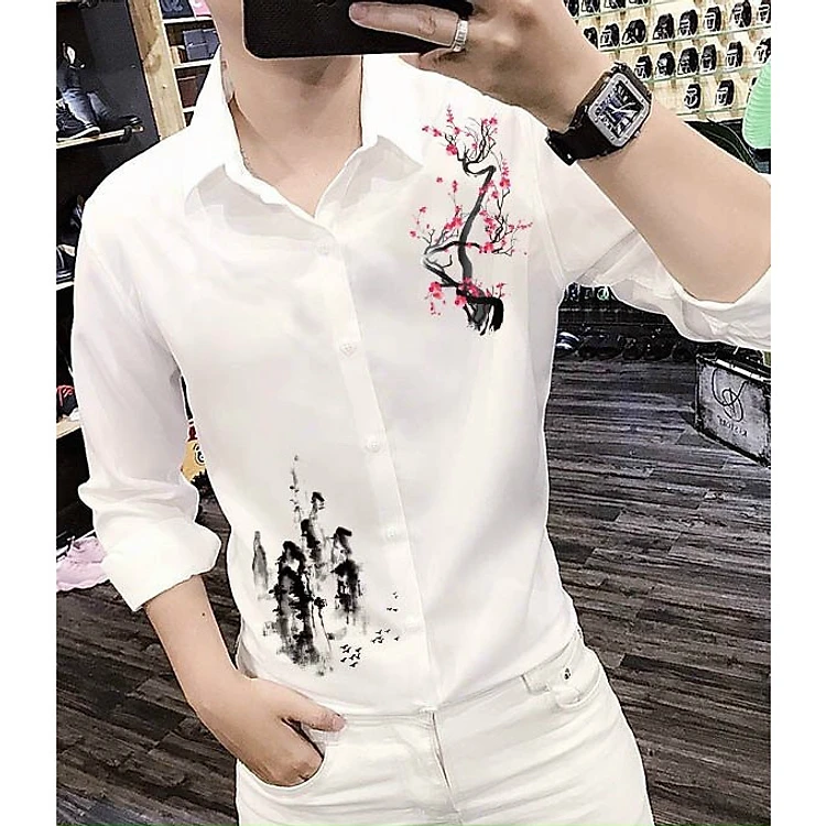Áo sơ mi nam họa tiết núi và cây hoa anh đào