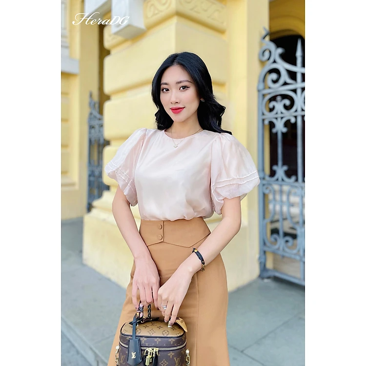 Áo sơ mi ngắn tay 2 lớp HeraDG thiết kê cổ tròn tay bồng dáng suông công sở điệu đà chất liệu tơ cao cấp SAKBC3023